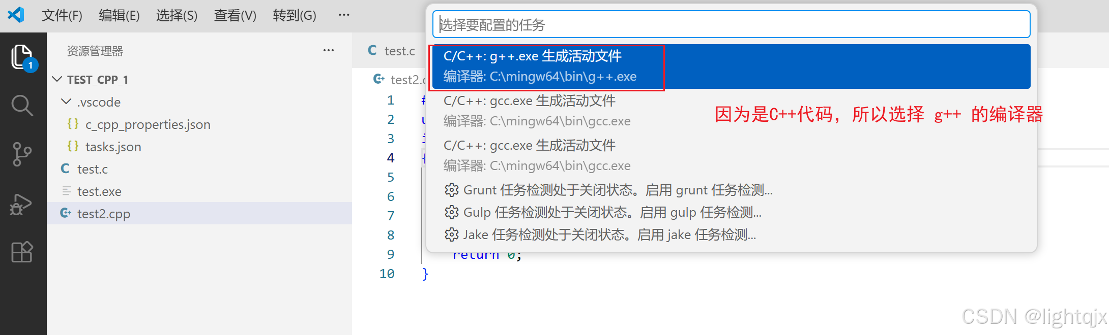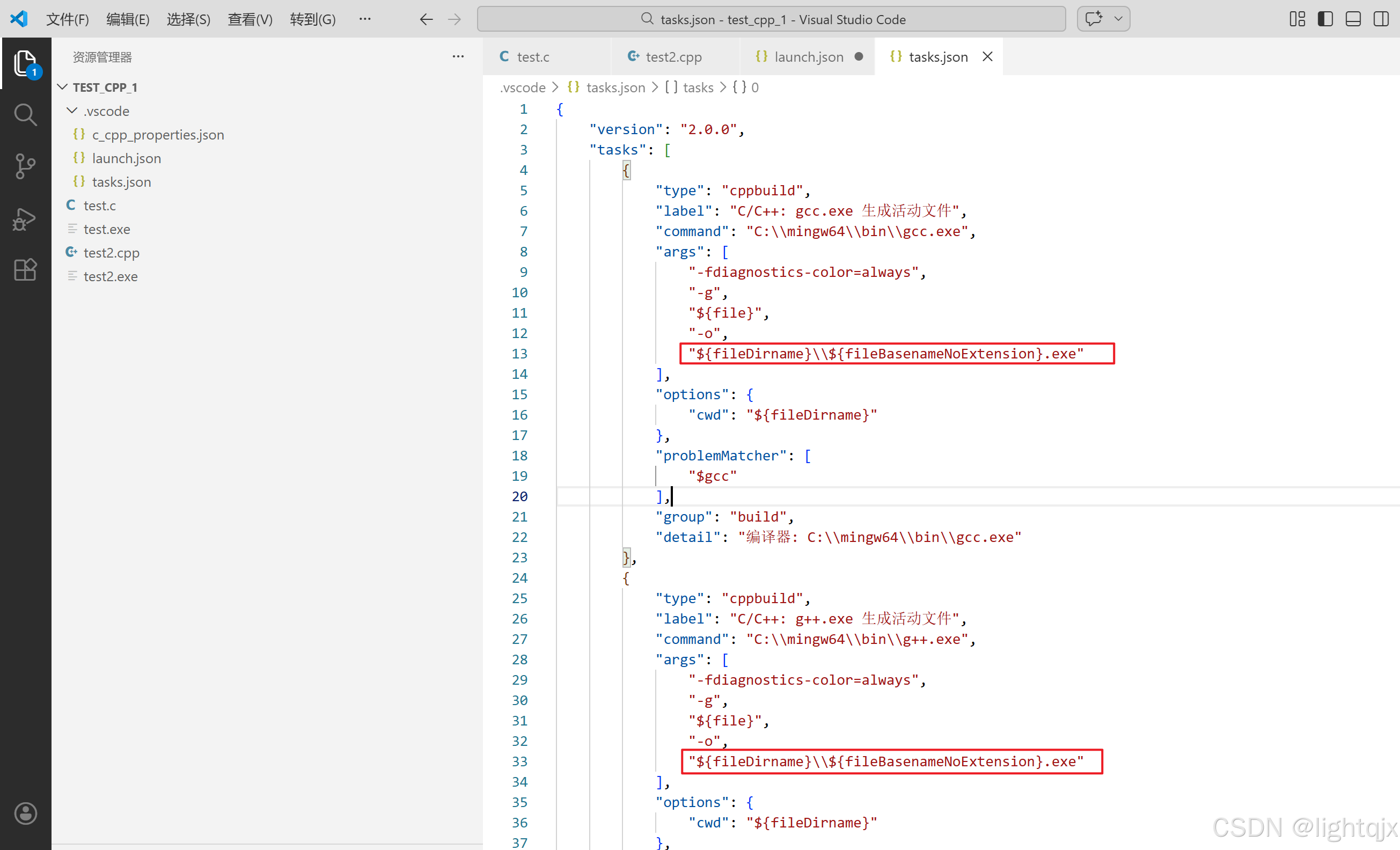 这是在tasks.json就添加了g++来编译代码的编译配置,如图所示: