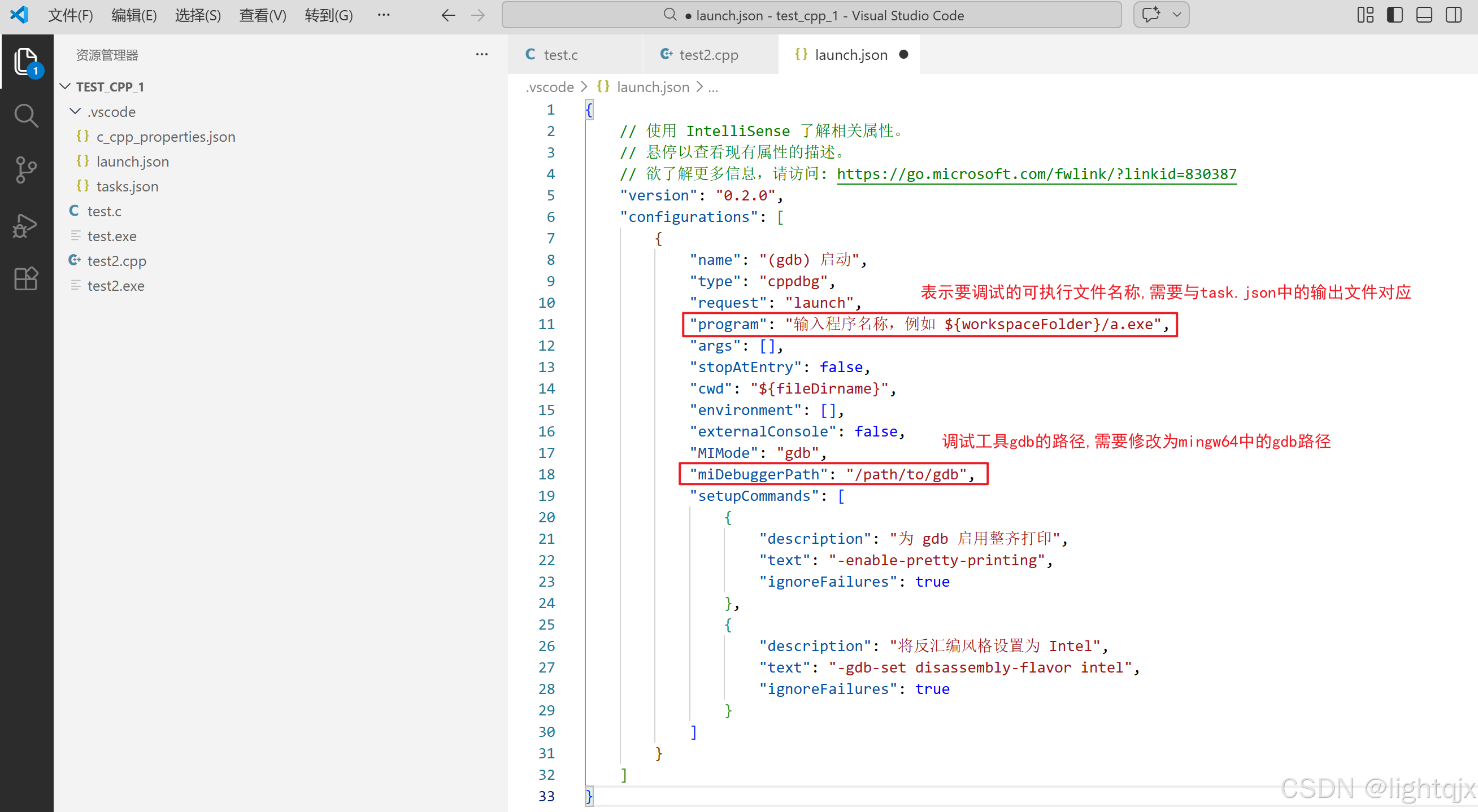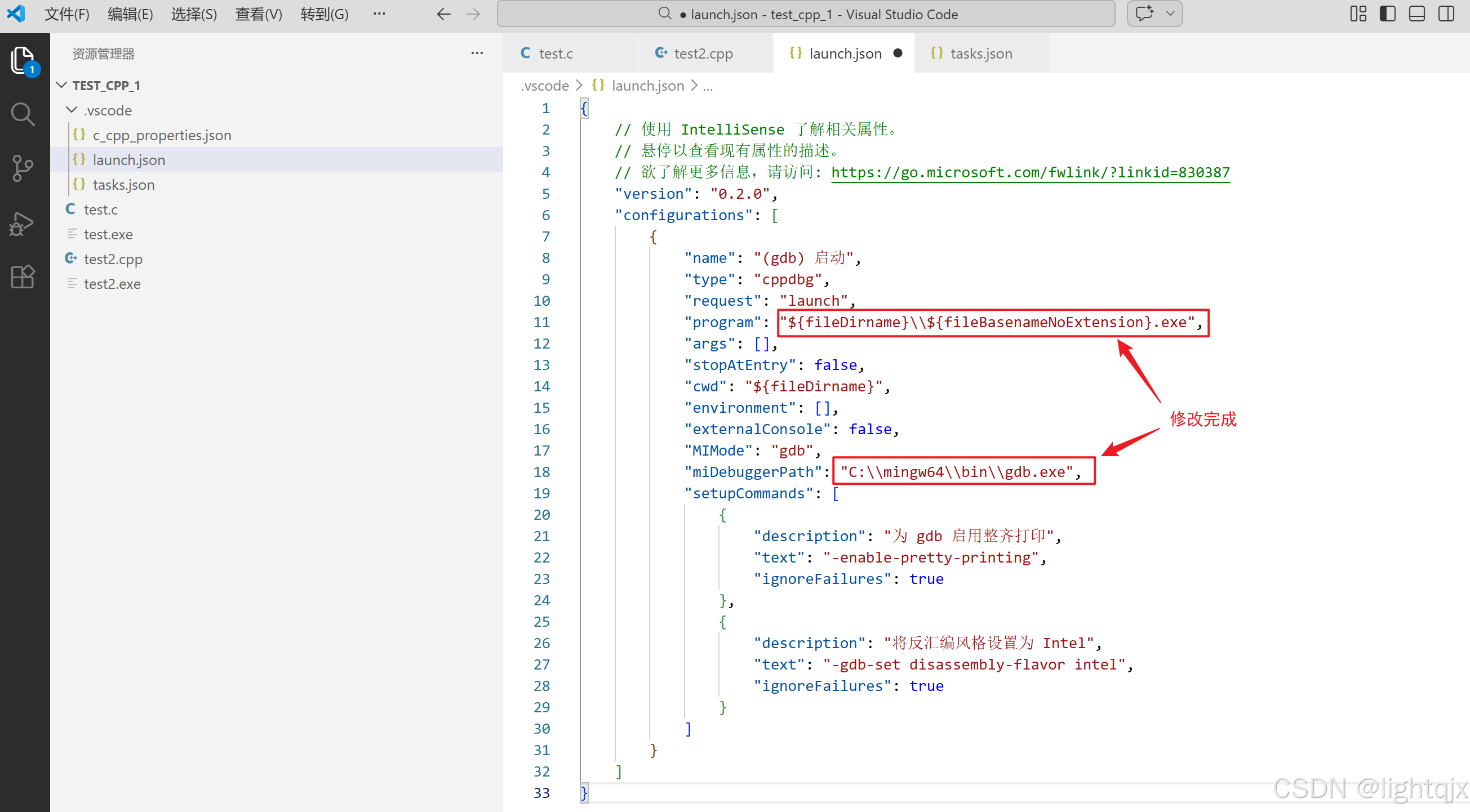 所以,在launch.json 文件中的program就可以修改为{fileDirname}\\\\{fileBasenameNoExtension}.exe,而miDebuggerPath中的信息则修改为C:\\mingw64\\bin\\gdb.exe。如图所示: