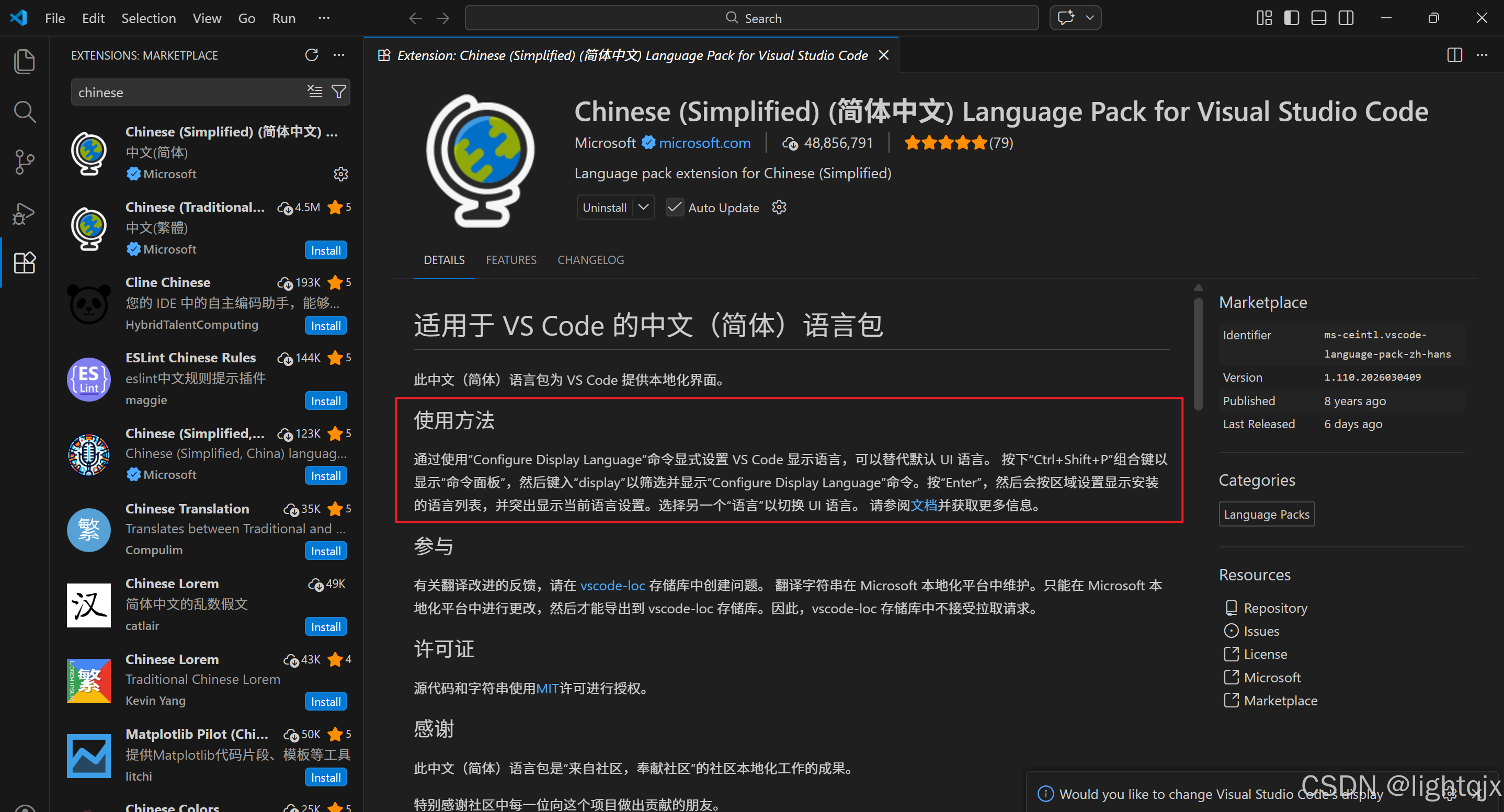 安装插件后,需要重启一下VS Code,这样我们的界面就是中文的了。最简单的方法就是在安装后点击如下的【Change Language and Restart】按钮,如图所示: