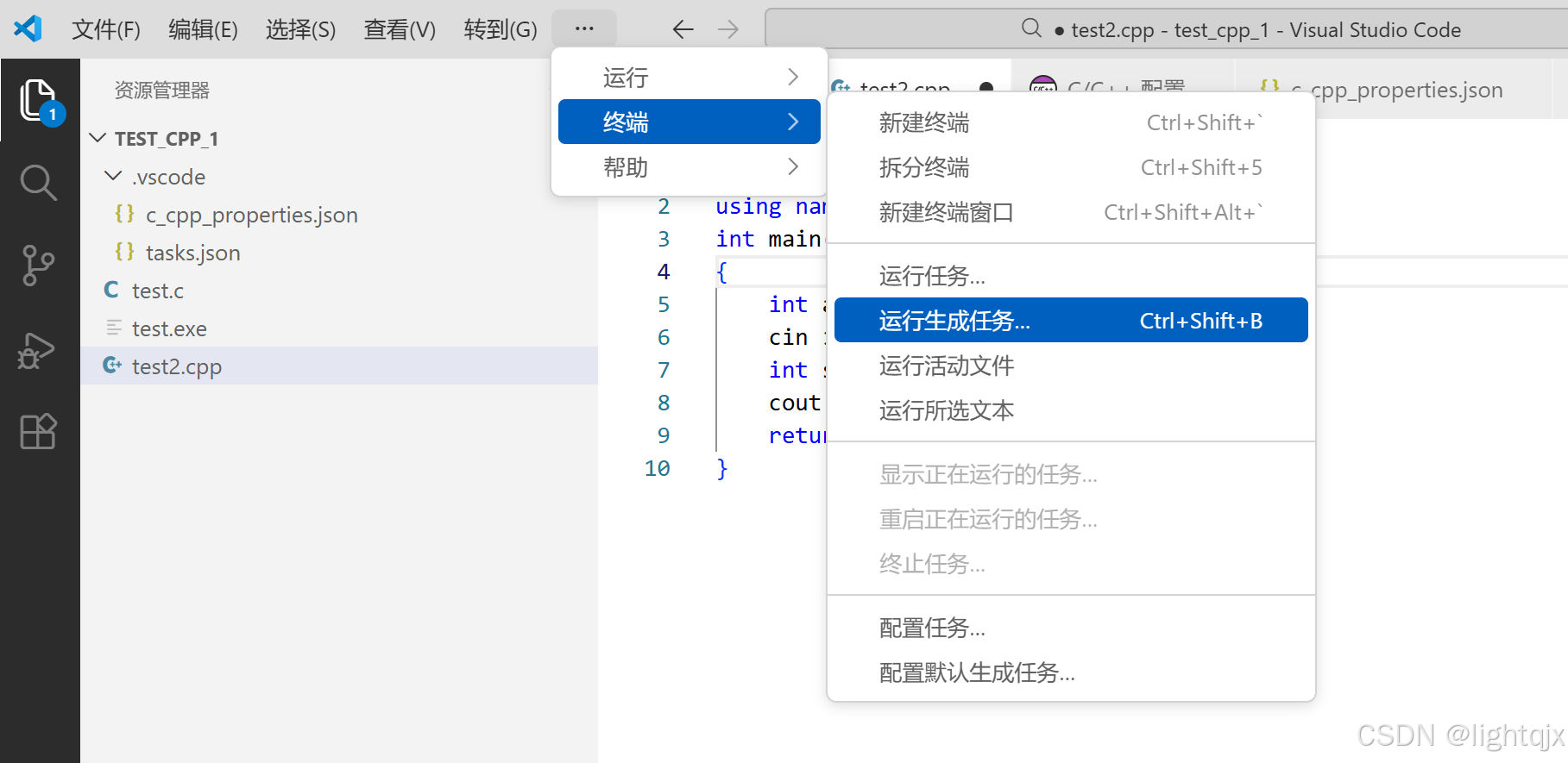 到这里,我们就可以编译运行C++代码了。首先选择【终端】中的【运行生成任务】,如图所示: