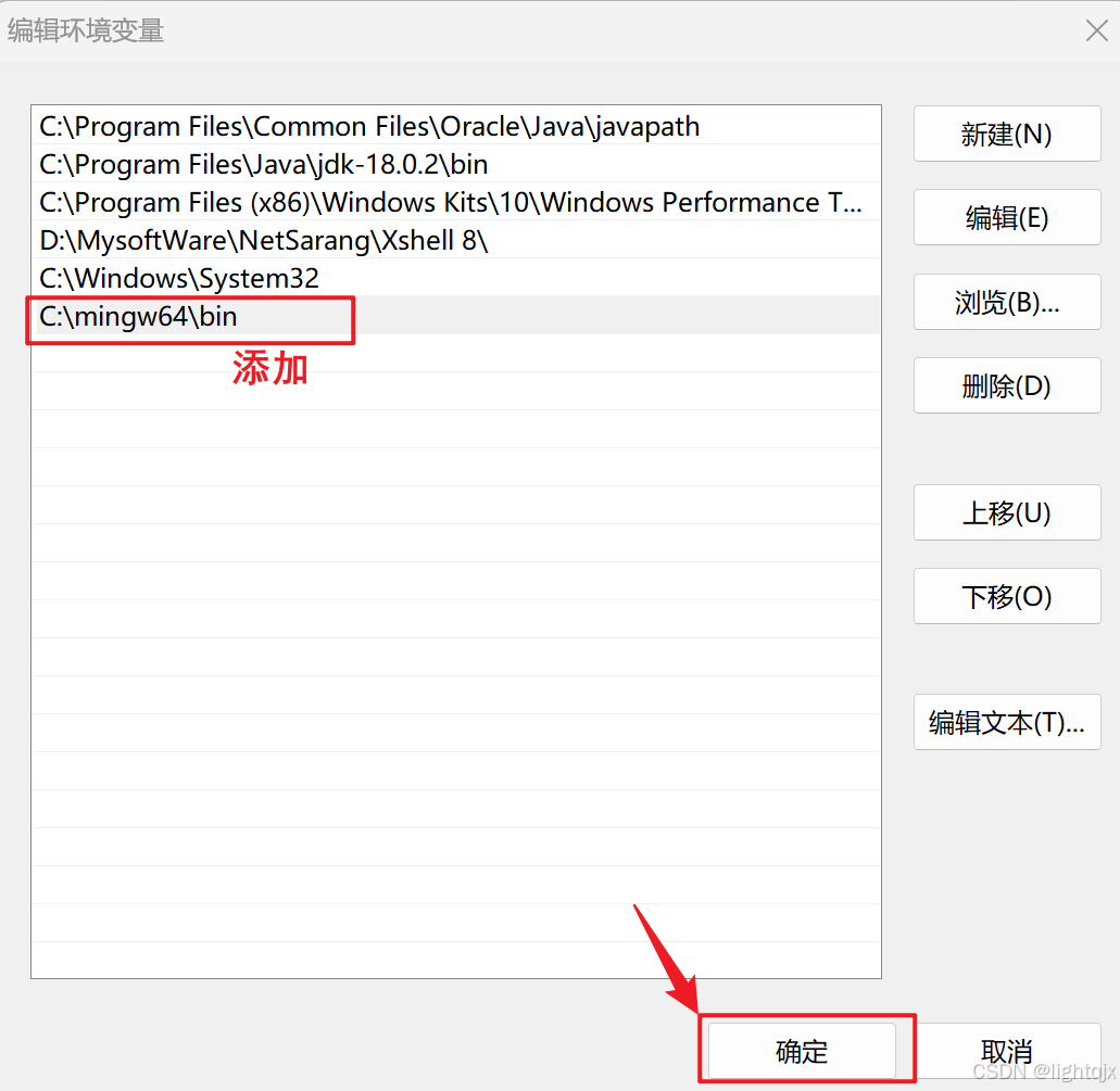 选择系统变量中的PATH,双击后,在其中将mingw64中的bin所在目录(即C:\mingw64\bin)添加到PATH中,在点击【确定】: