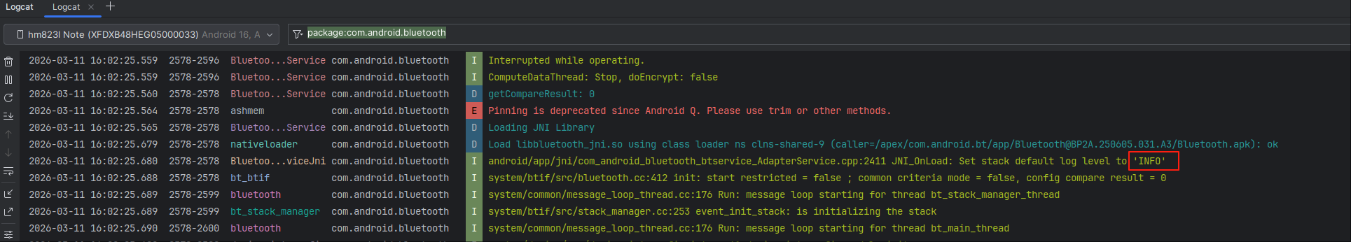 JNI_OnLoad里调用了上面提到的__android_log_set_minimum_priority方法,当加载so库的时候,会先调用JNI_OnLoad方法。观察bluetooth启动日志也发现了相关信息。