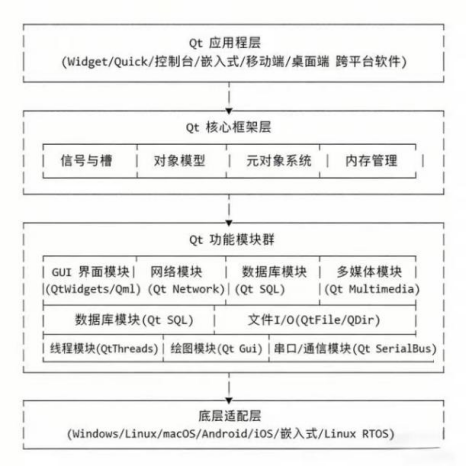 Qt是软件开发中必备的跨平台C++开发框架,像开发者的"万能积木",能开发多设备多系统的应用。它主打跨平台,核心开发图形界面程序,也能做后台服务等,一套代码适配多系统,还配套全流程开发测试工具,大幅节省开发成本。图1给出了Qt的产品架构图。
