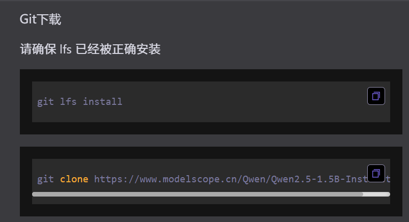 modelscope download --model Qwen/Qwen2.5-1.5B-Instruct#下载完整模型