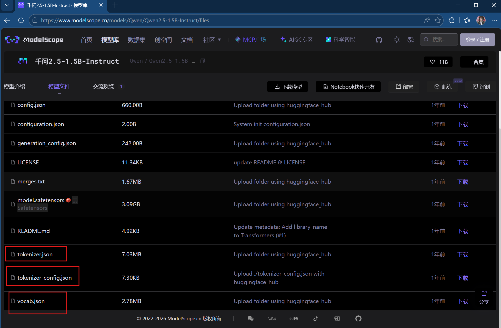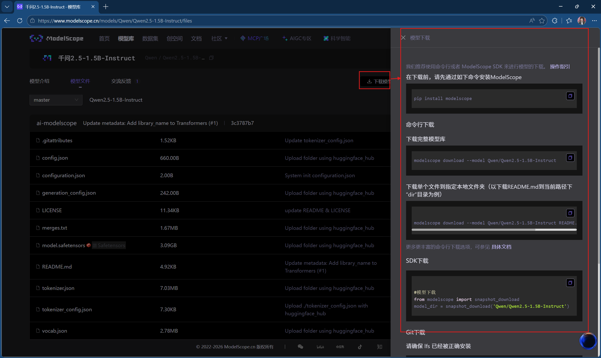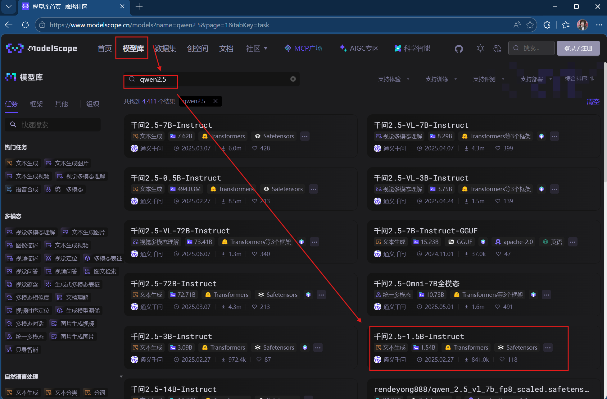 1.打开魔搭社区网页,在模型库中下载模型,这里我们选择千问2.5-1.5B版本