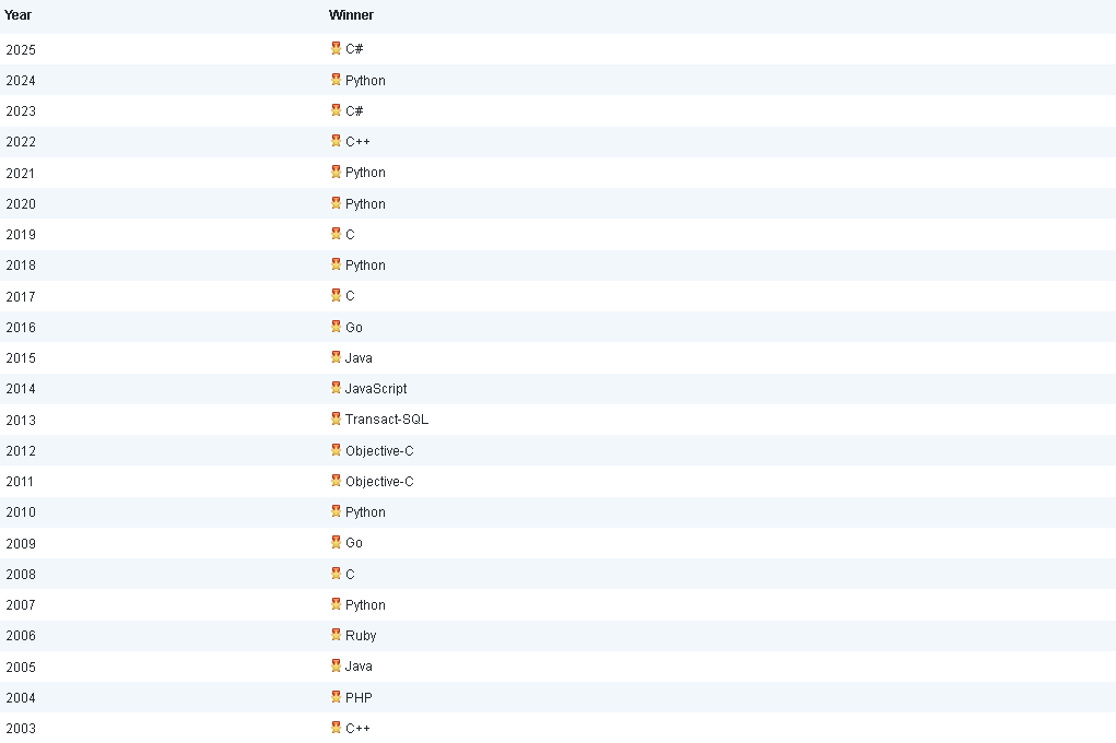 下方列出了所有"年度编程语言"奖的获奖者。该奖项授予在一年内评分涨幅最大的编程语言。