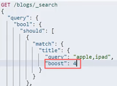 | boosting: 文档级别,默认是1,设为0到1之间就是降低评分. 构造查询条件的时候指定某个字段的权重. 适用于某些特定场合的查询.比如查询时需要以某某条件为主 场景: 给热门产品更多权重 |