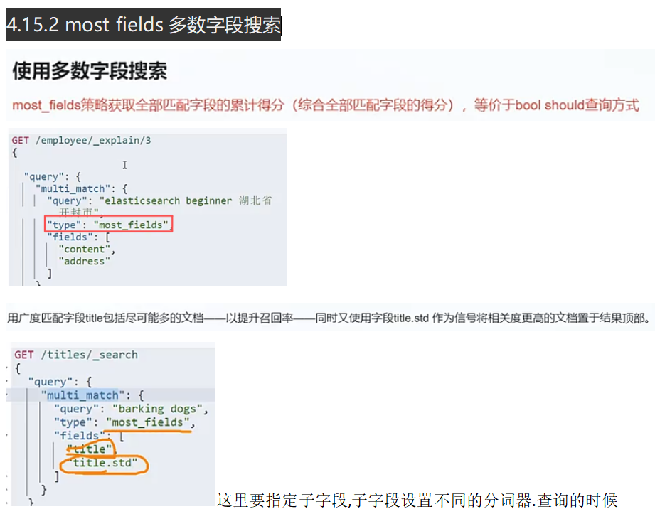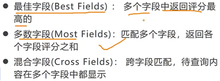 最佳字段:比如博客的标题和内容字段,都含有查询关键词的话,结果得分是求和的.(多字段查询一般是should查询)