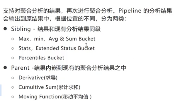 | 指标聚合: 最大,最小,count,求和,平均 桶聚合: group by,range,直方图 管道聚合:基于上一次聚合的二次聚合 |