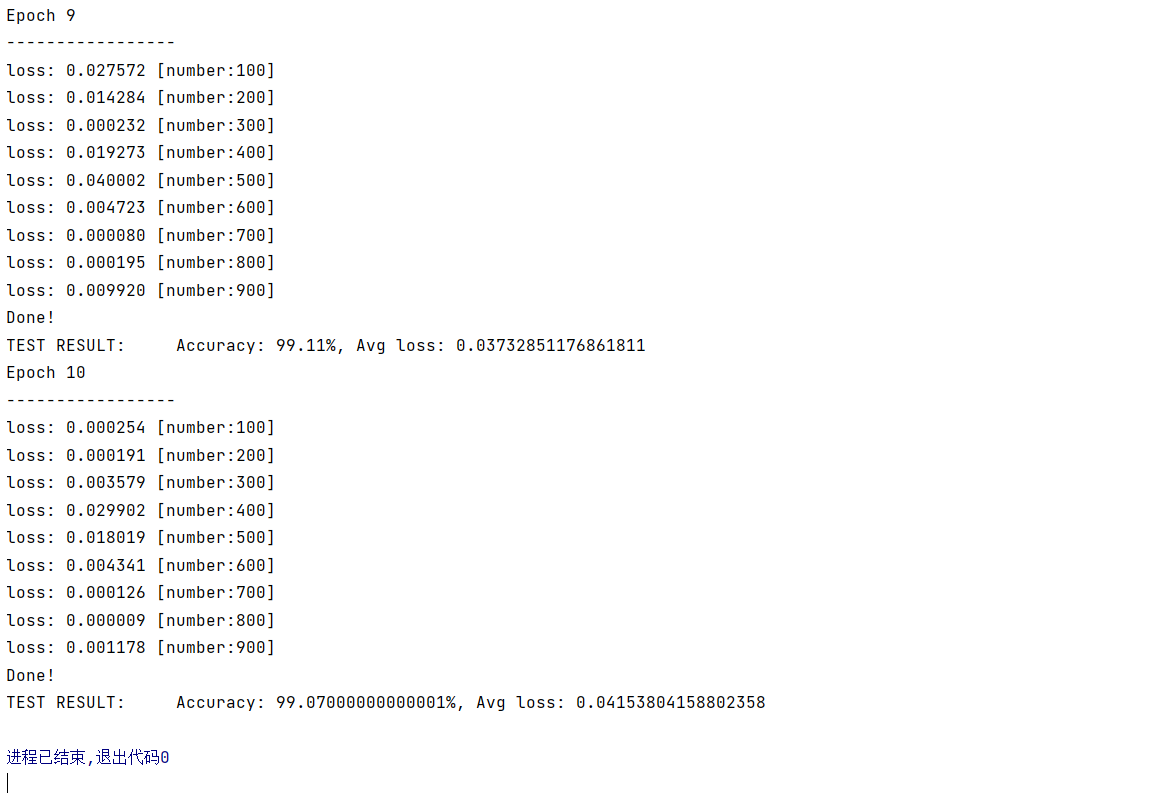 训练10轮后,模型在测试集上的准确率可达98%以上,平均损失逐步降低,说明模型有效学习了手写数字的特征。