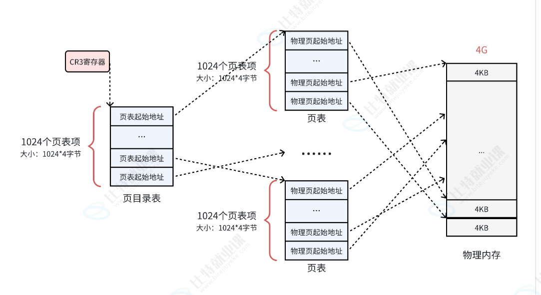 - 前10位表示页表的目录,可以表是1024个页表。决定了这 4GB 空间里的最高层级。 2 10 2^{10} 210 = 1024,对应页目录表里的 1024 个目录项。