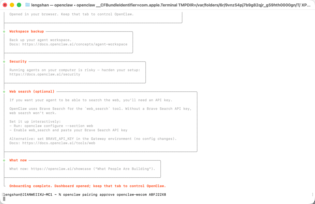 - 会收到一个配置密钥。复制此信息最后一行,并输入在终端中,完成配对
