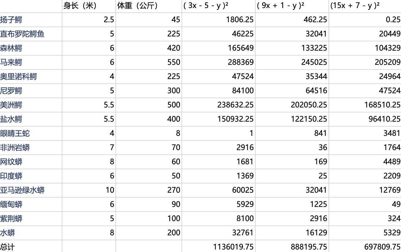 把训练数据带入到公式内(3x - 5 - y),发现误差很大,大部分都是小于0的,都是鳄鱼。