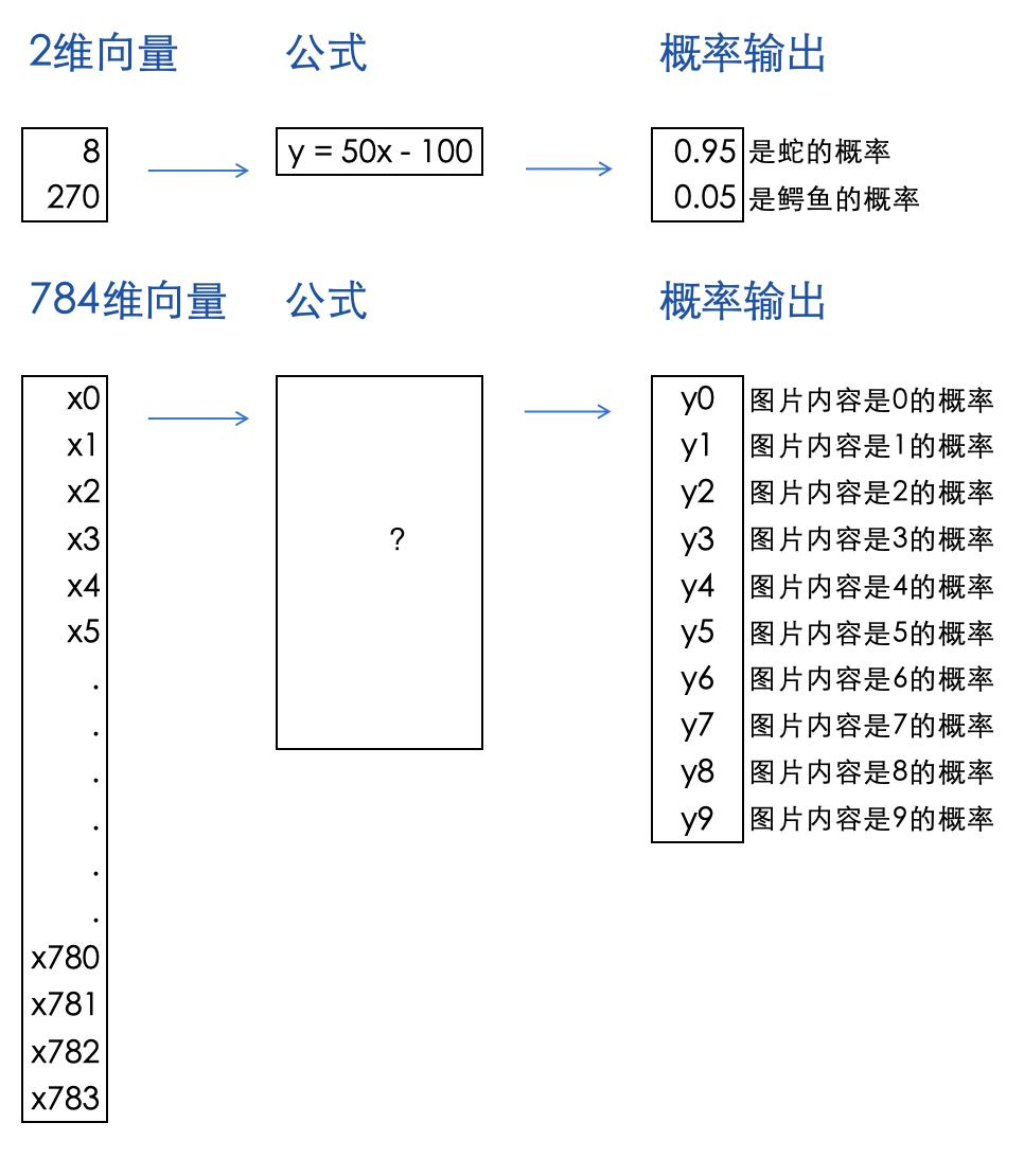 之前小模型"识别鳄鱼与蛇"的数学公式:y = 50 * x - 100,那么这个784维数据的图片识别的模型公式是?