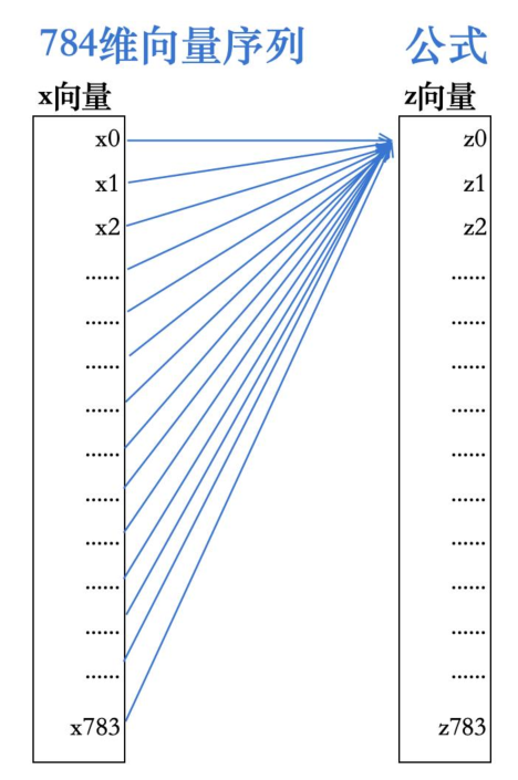 第一层神经网络,z0的公式:z0 = w0 * x0 + w1 * x1 + w2 * x2 +...+ w781 * x781 + w782 * x782 + w783 * x783 + w784