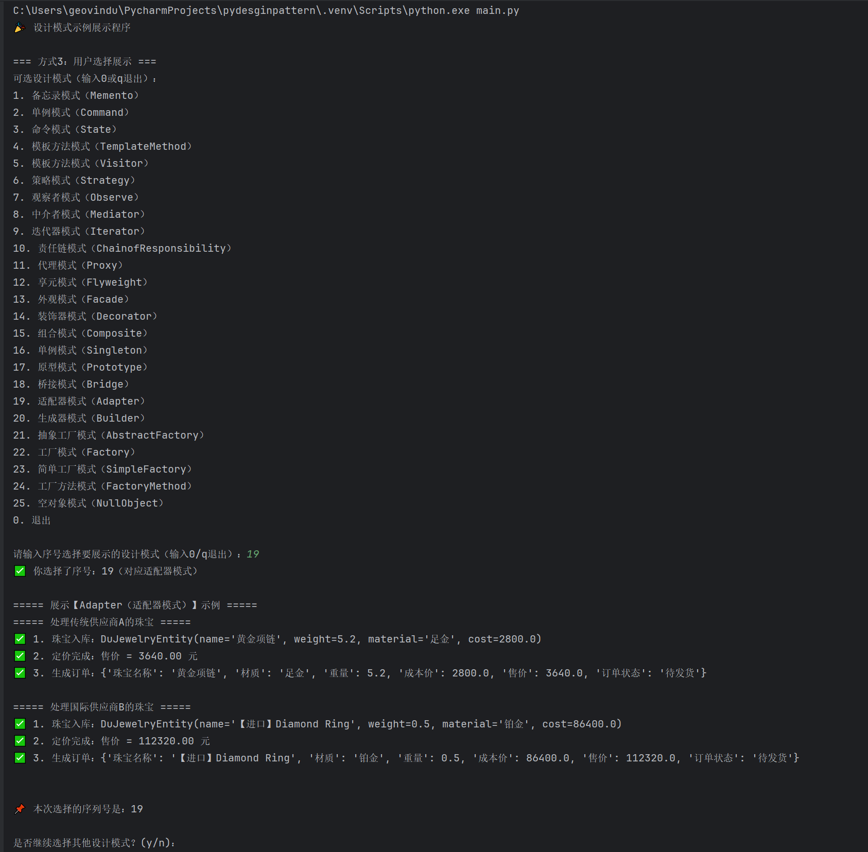 user_input = input("\n请输入序号选择要展示的设计模式(输入0/q退出):").strip()