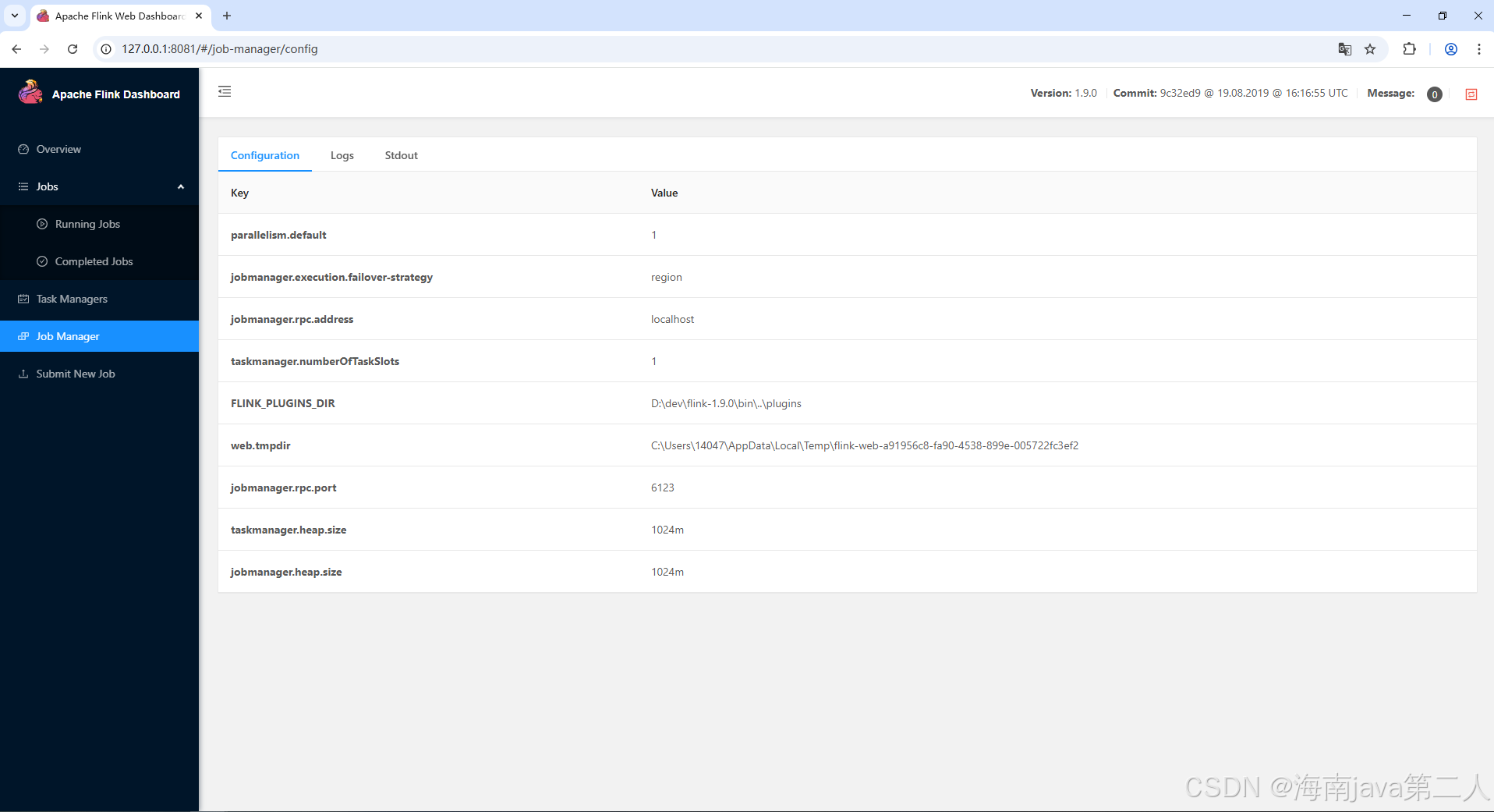 Job Manager 页面展示的是 Flink 集群主节点的信息,主要包括配置参数和系统日志。与 Task Managers 不同,这里关注的是集群层面的状态,而非具体任务。