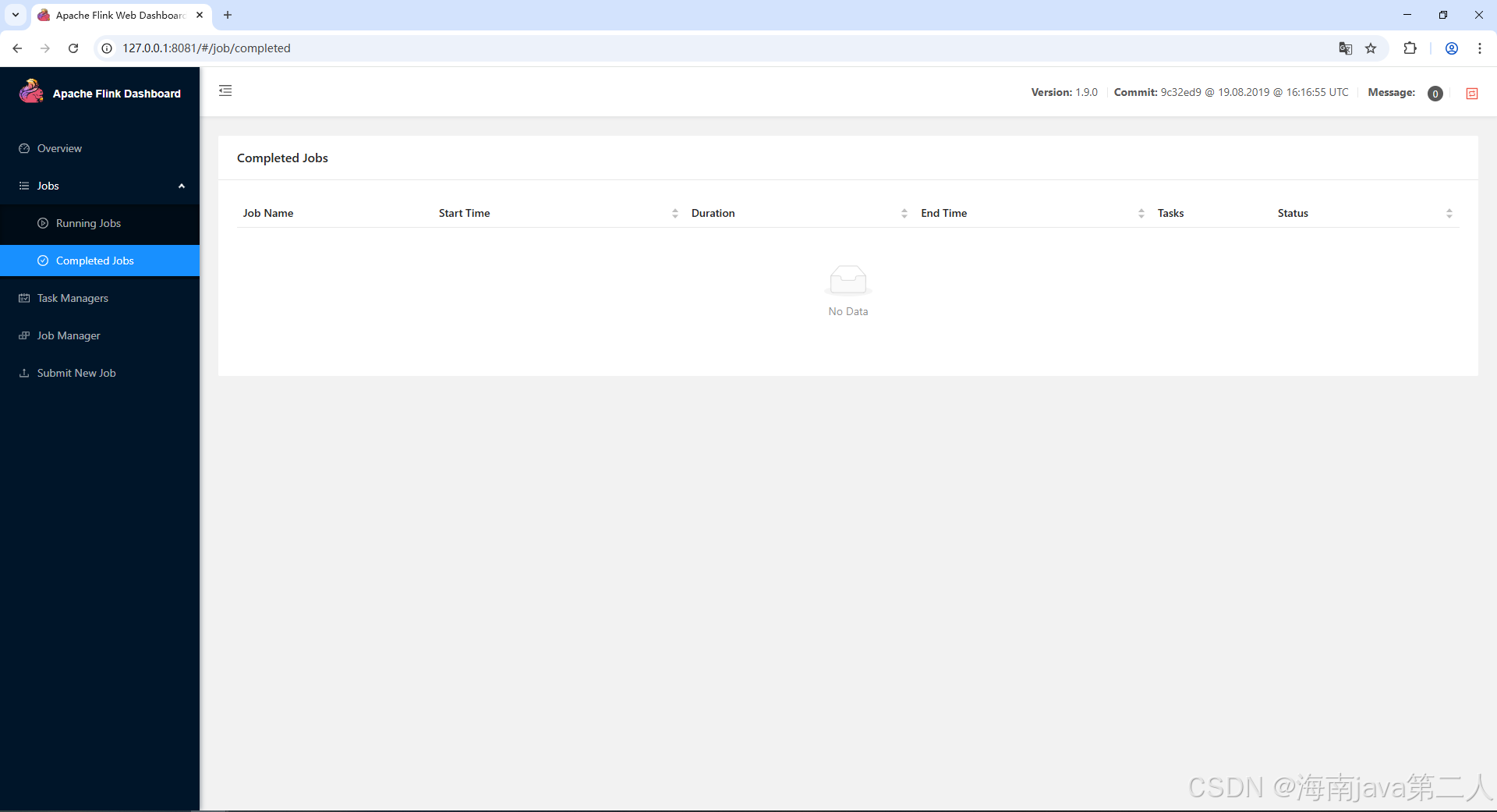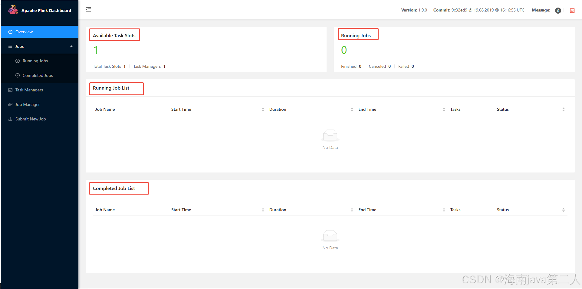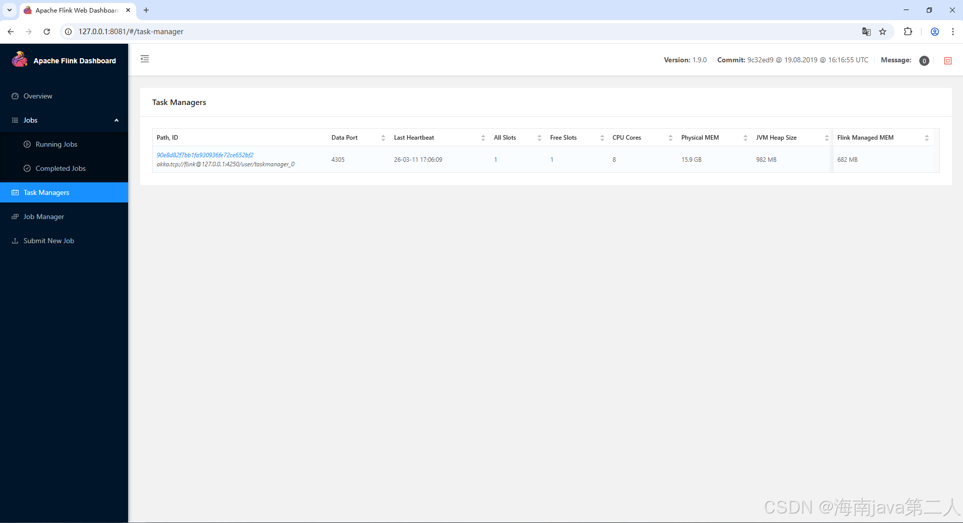- JobManager:显示当前活跃的 JobManager 地址和版本信息(如 Flink 版本号、Commit ID)。