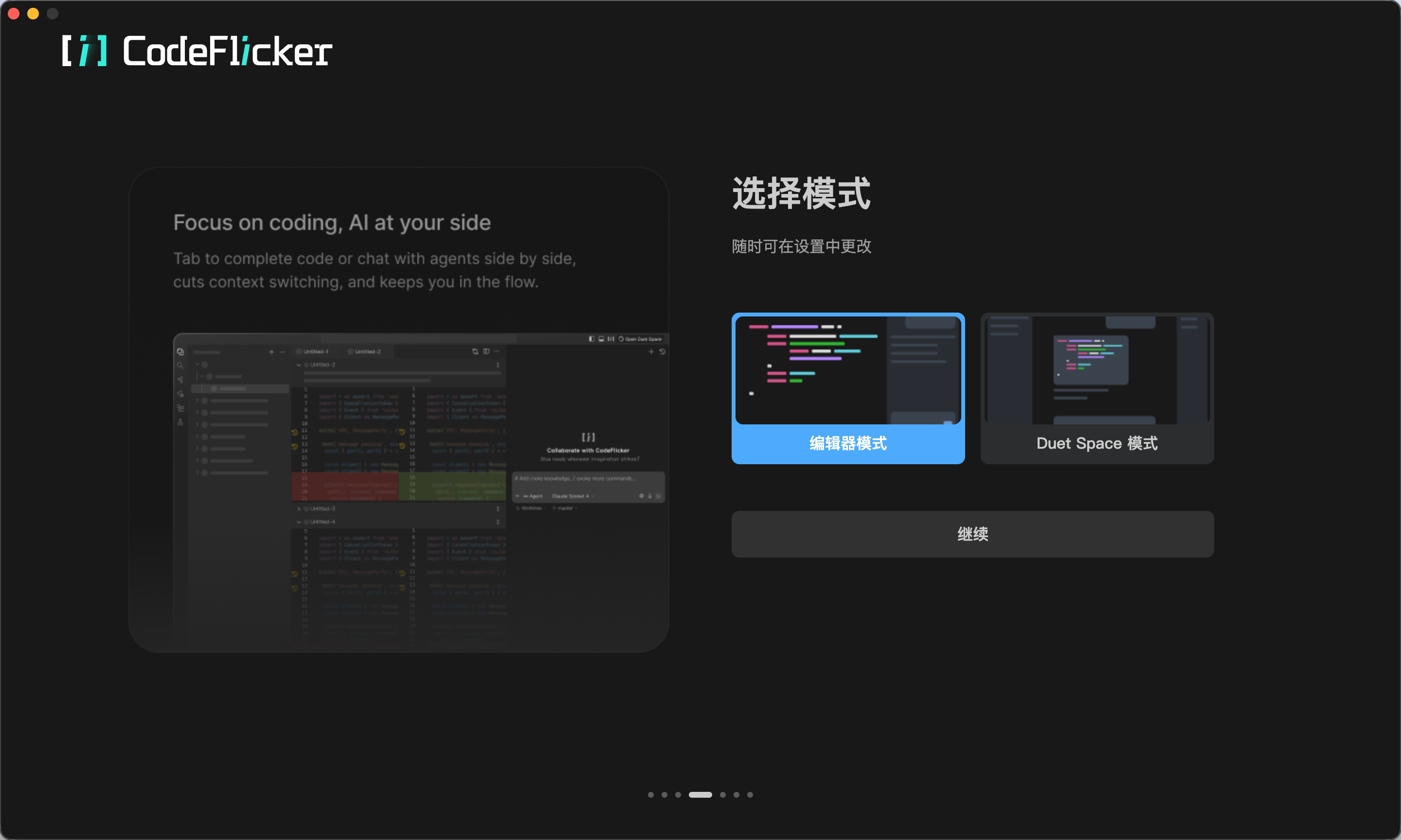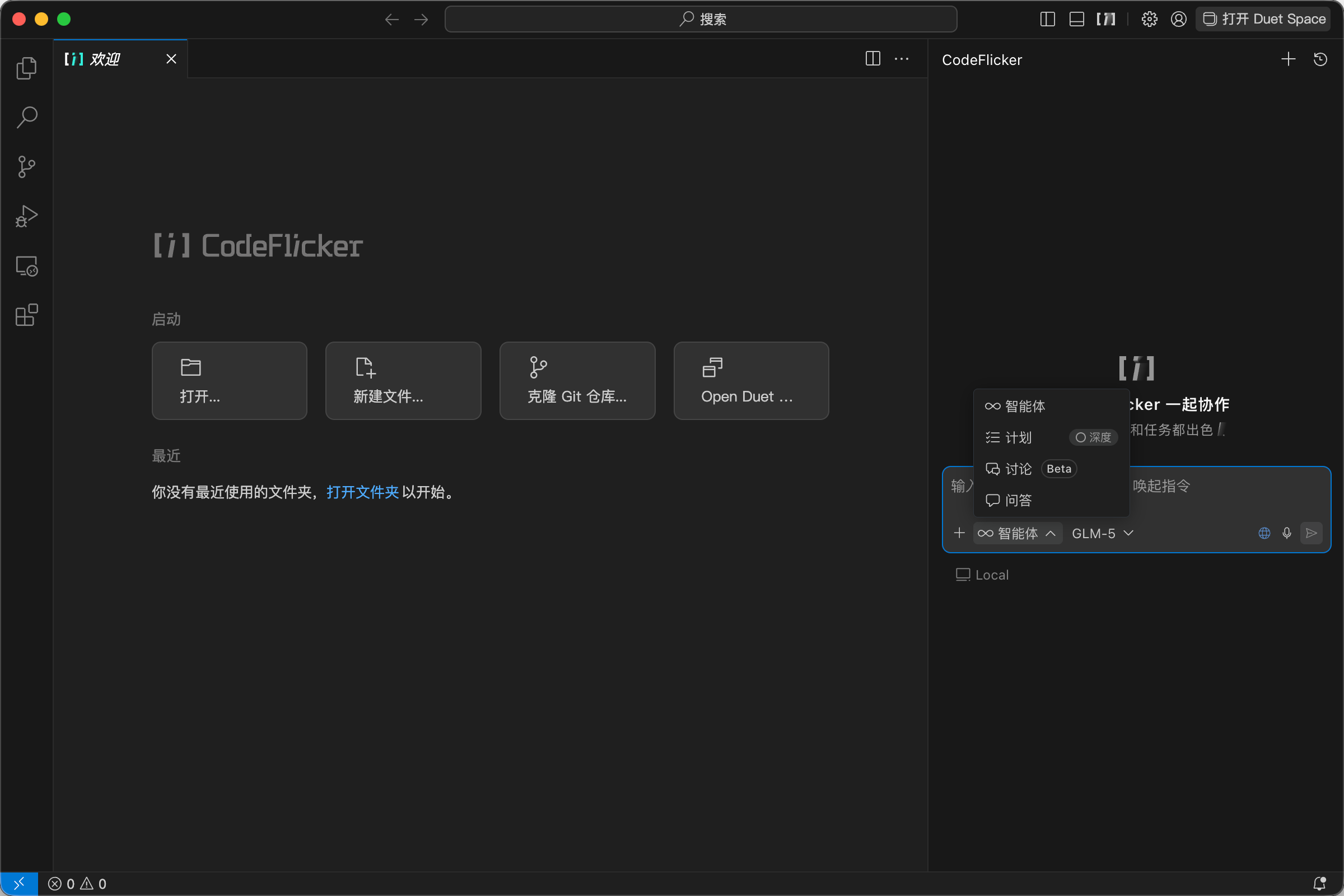 CodeFlicker 提供一个独立的桌面端 IDE 应用,界面与 VS Code 高度相似(基于同一底层 Monaco 编辑器),但深度集成了 AI 对话面板、AI 补全引擎和 AI 代码操作菜单,开箱即用,无需额外配置插件。