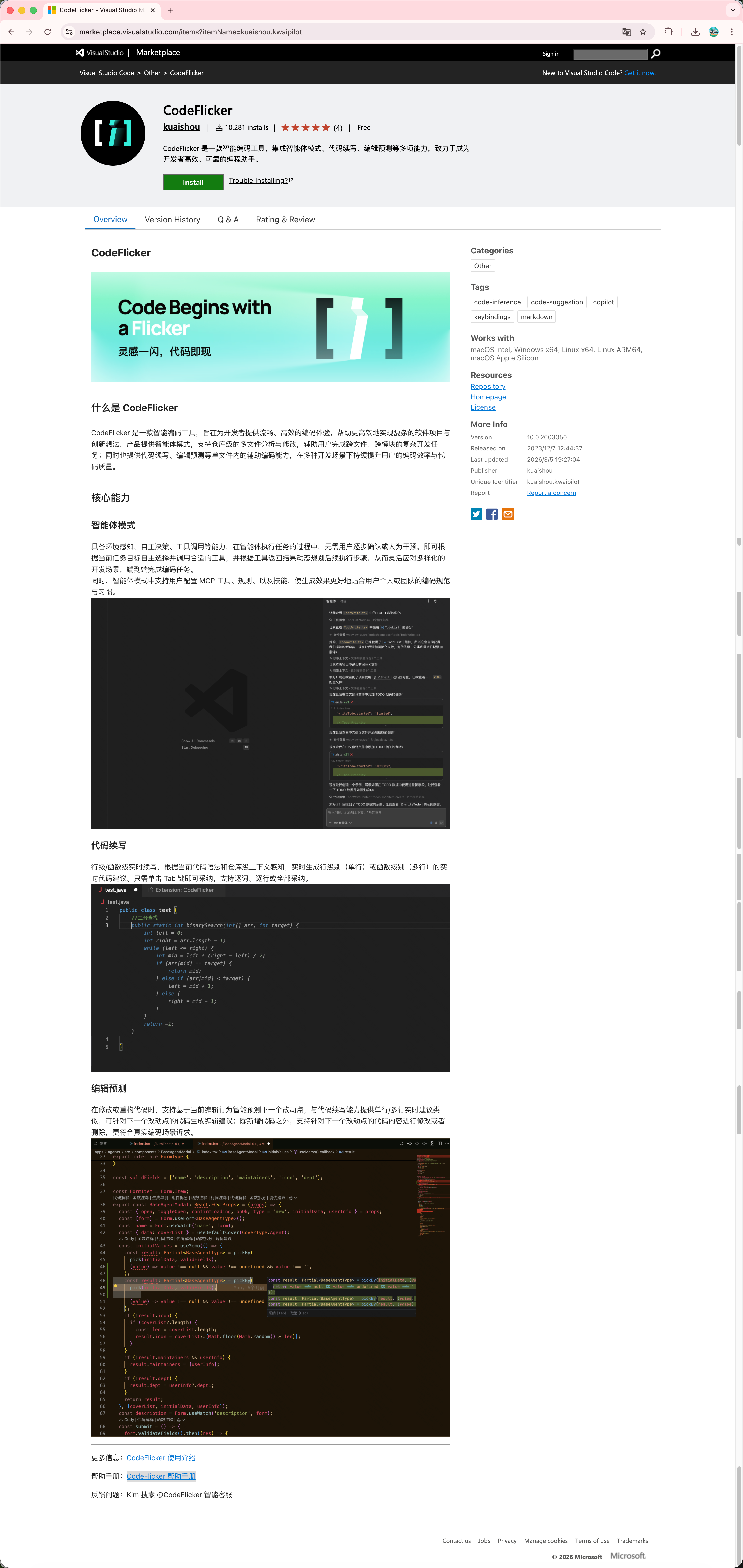- CodeFlicker VS Code 插件(VS Code 市场页面,可查看安装量、评分、版本历史):