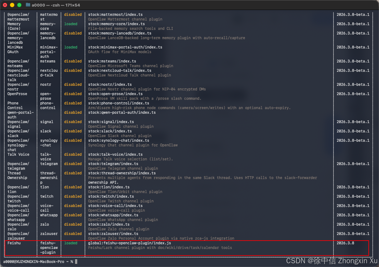 运行 openclaw plugins list,ID为 feishu-openclaw-plugin 的 Status 为 loaded ,ID为 feishu 的 Status 为 disabled 则标明已成功启用飞书官方插件。
