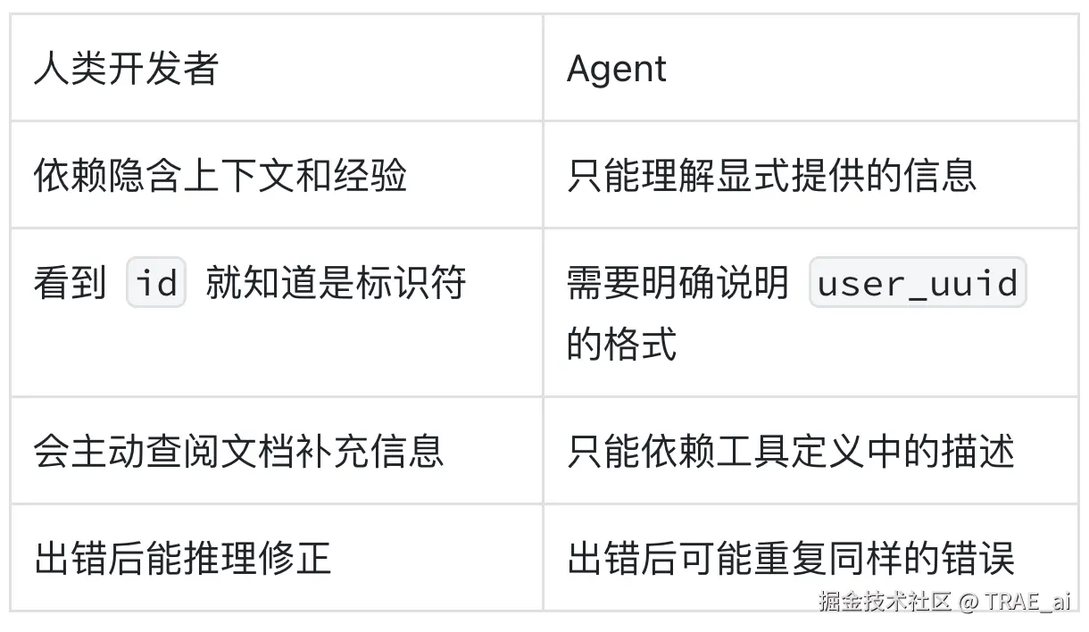 传统 REST API 是为人类开发者设计的,我们假设开发者会阅读文档、理解上下文、在出错后调试代码,但 Agent 是完全不同的「用户」,它不会主动查阅文档,不擅长从上下文中推断隐含信息,每次调用都需要从头开始理解工具的用途。
