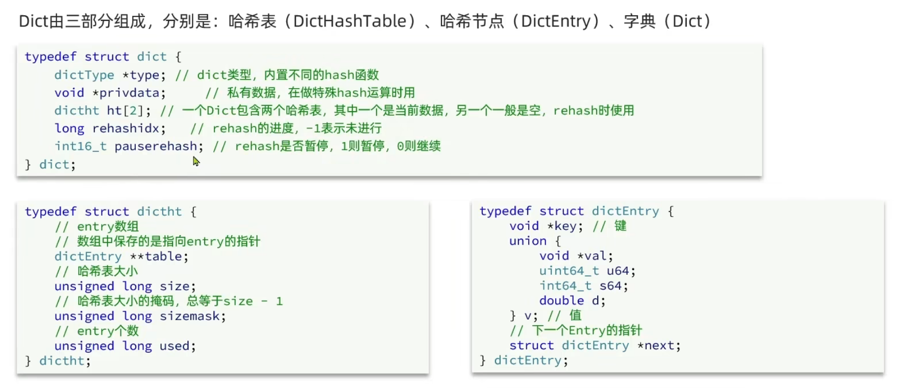 Dict除了扩容以外,每次删除元素时,也会对负载因子做检查,当LoadFactor < 0.1时,会做哈希表收缩: