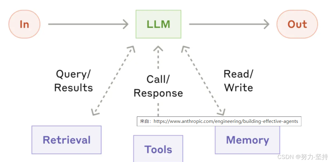 增强型智能体的基本构建块是一个增强的LLM,其中包含检索、工具和记忆等增强功能。