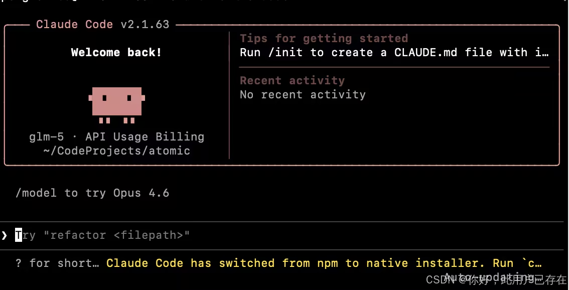 命令行进入项目目录后,执行 claude 命令启动 Claude Code 即可开始使用。