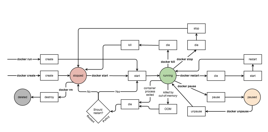 - 容器有初建、运行、停止、暂停和删除五种状态。