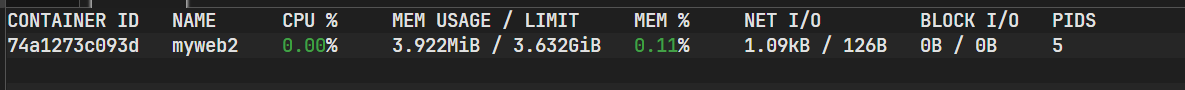 CONTAINER ID NAME CPU % MEM USAGE / LIMIT MEM % NET I/O BLOCK I/O PIDS