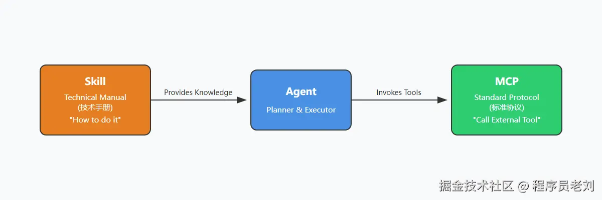 而skill是给Agent的一本技术手册,它可以告诉Agent如何完成某个特定的任务,比如计算器这个skill,就能告诉Agent如何进行加减乘除等运算。