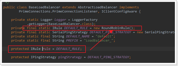 负载均衡的规则都定义在IRule接口中,而IRule有很多不同的实现类: 默认的实现就是第一种轮询方案。
