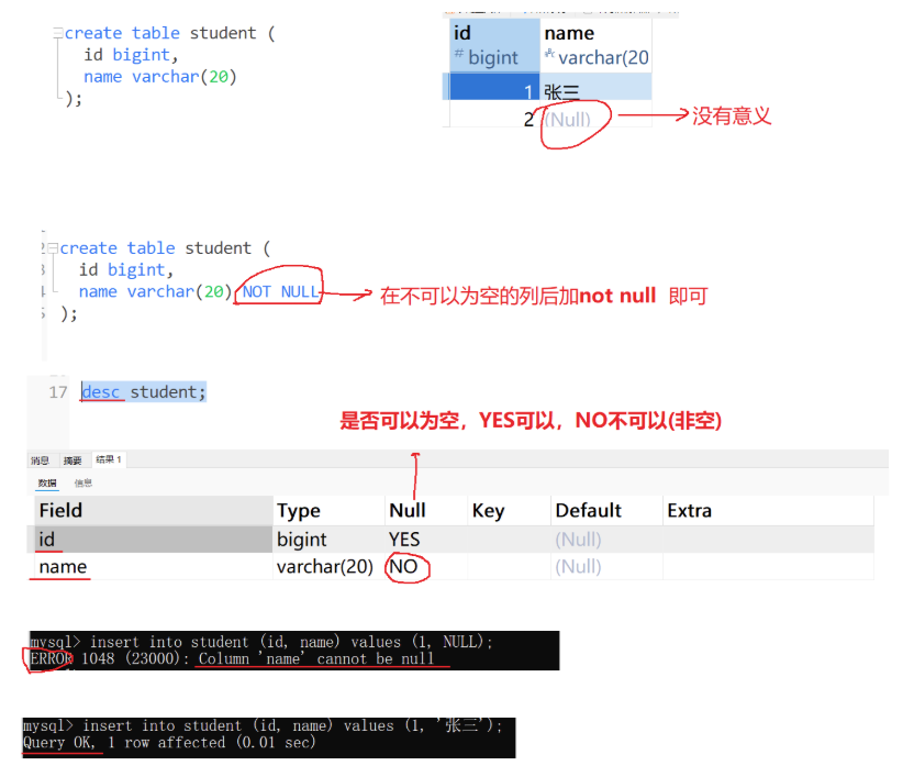 - 比如创建⼀个学⽣表,学⽣名为NULL时,这条记录是不完整的