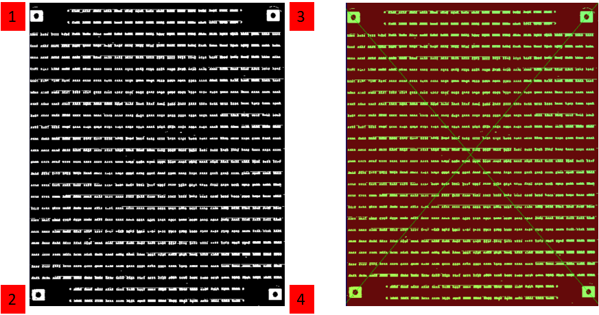 产品定位:将被测FPGA器件放置在检测平台上,确保器件放置平稳、无晃动。启动检测软件,获取产品的3D轮廓图,同时对3D图进行灰度成像处理,通过灰度对比,清晰呈现产品的轮廓边界和焊点位置,便于后续定位和检测。在产品3D灰度图中,选取4个特征区域(分别标记为点位1、点位2、点位3、点位4),每个区域内均有明显的圆形特征,提取各区域圆形特征的圆心坐标,计算点位1、4区域圆心的连线,以及点位2、3区域圆心的连线,两条连线的交点坐标即为产品的定位基准点,将该基准点坐标传入产品3D图中,完成产品的精准定位,确保后续检测过程中,焊点位置的识别和高度计算不受产品放置偏差的影响。