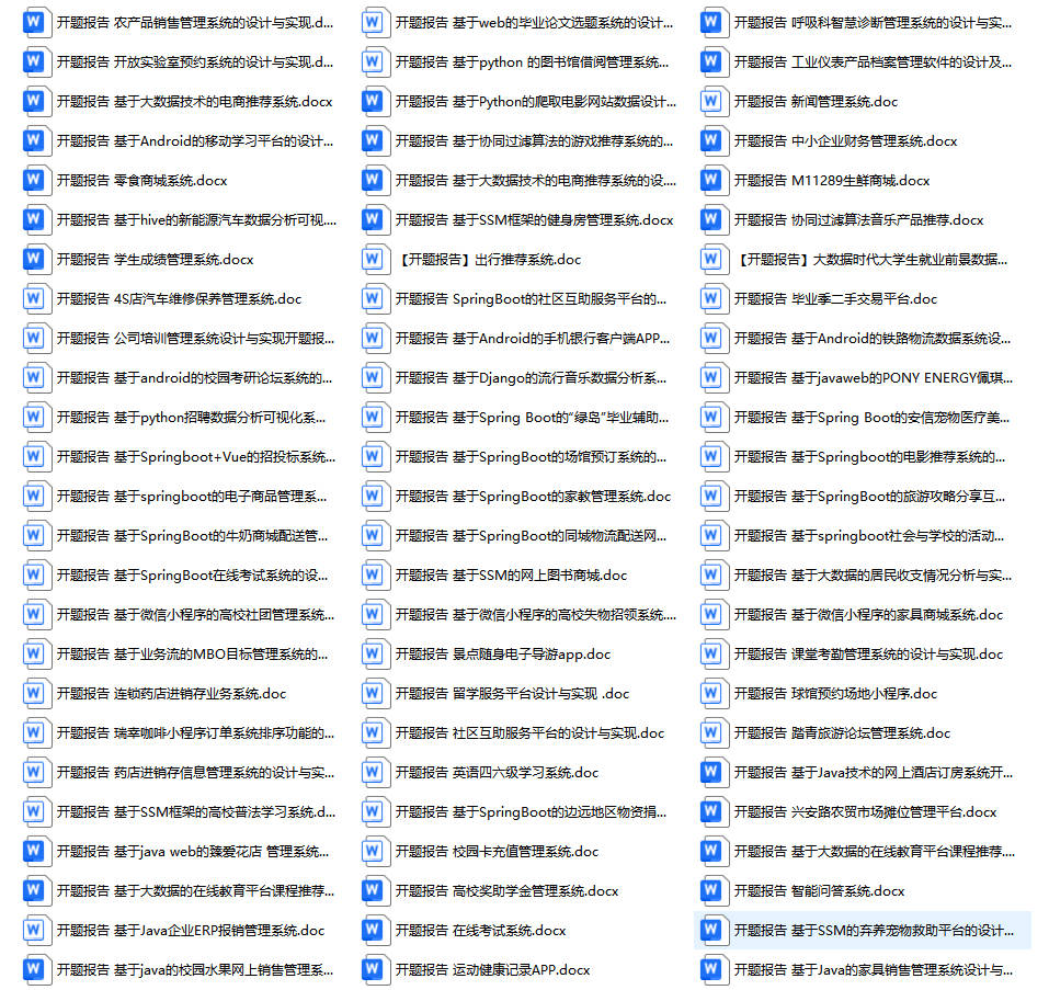 以上是某同学的毕业设计答辩的过程,如果你现在还没有参加答辩,还是开题阶段,已经选好了题目不知道怎么写开题报告,可以下面找找有没有自己符合自己题目的开题报告内容,列表中的开题报告都是往届真实的开题报告,可发送使用或参考。文末或底部来联xi可免费获取