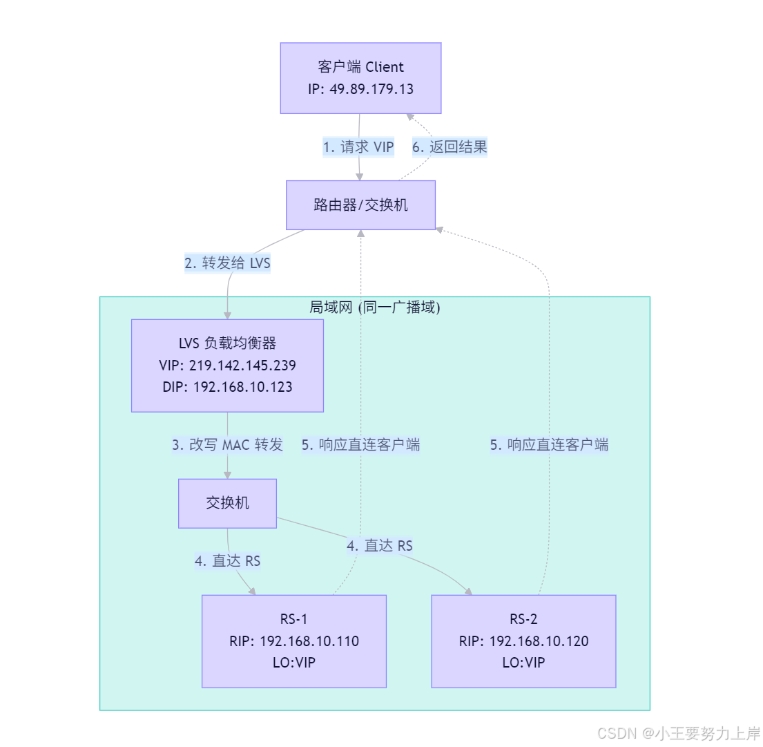 - 结果 :响应包绕过 LVS,直接经由交换机/路由器返回给 Client。