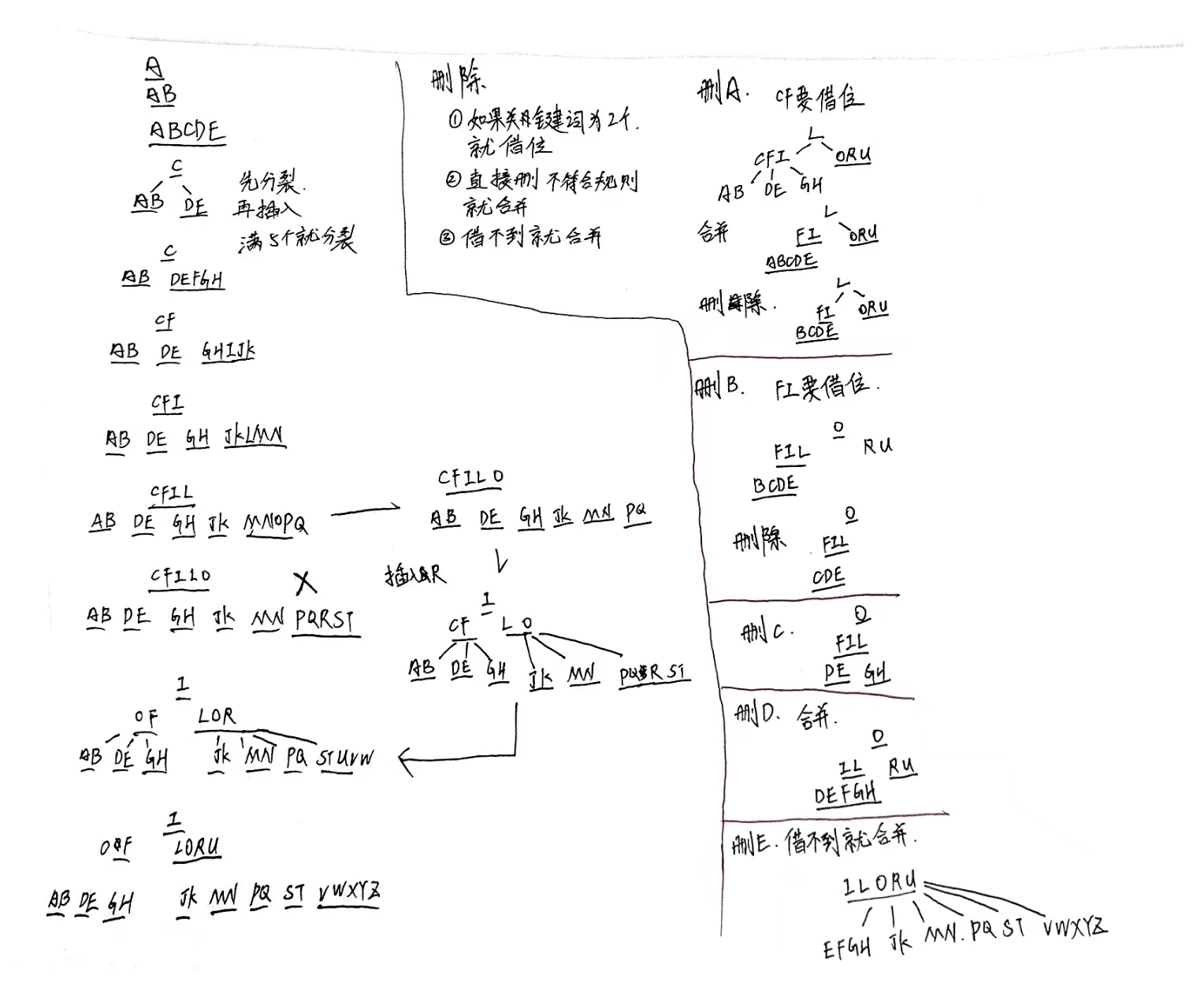 删除A的时候,结点[CF]需要借位,借位后,结点[AB]需要合并