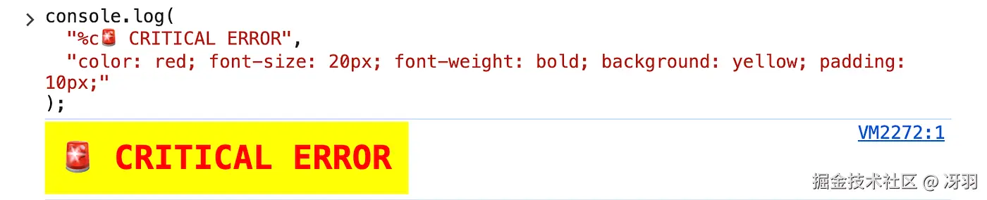 console.log("%c CRITICAL ERROR", "color: red; font-size: 20px; font-weight: bold; background: yellow; padding: 10px;");