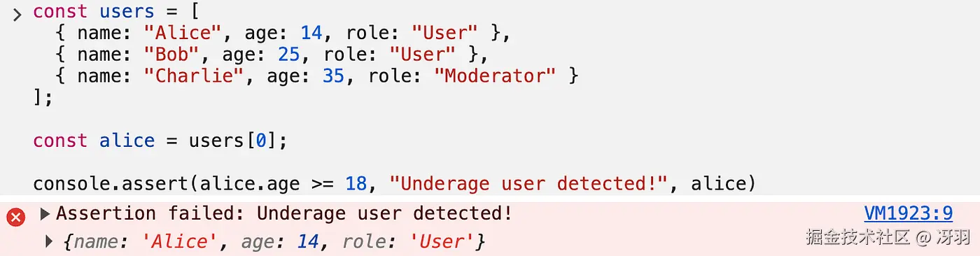 console.assert(user.age >= 18, "Underage user detected!", user);