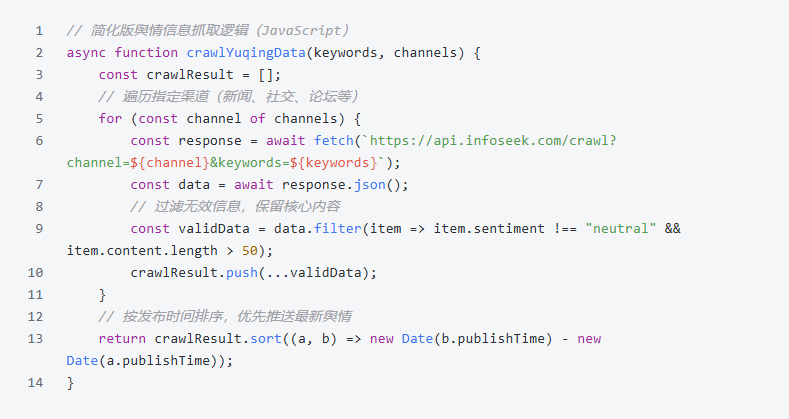 Infoseek 舆情监测系统采用全时段自动化监测模式,监测范围覆盖新闻网站、社交媒体、主流论坛、短视频平台等核心网络渠道,累计覆盖8000多万个信息节点,实现舆情监测无死角。系统内置高效信息抓取脚本,可快速采集各渠道数据,核心逻辑简化如下: