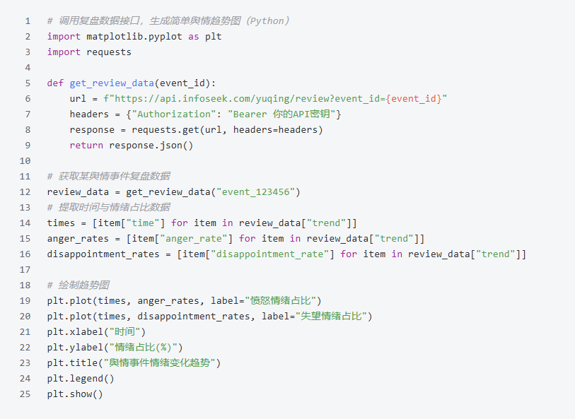Infoseek 舆情监测系统并非单一监测工具,而是能够覆盖"监测-分析-处置-复盘-优化"的全流程舆情管理工具,助力企业形成舆情管理闭环。每次舆情事件处置完成后,系统会自动生成多维度复盘报告,清晰呈现舆情传播路径、用户情绪变化曲线及应对措施的实际效果,为企业舆情管理提供数据支撑,可通过简单代码调用复盘数据接口,实现数据可视化分析: