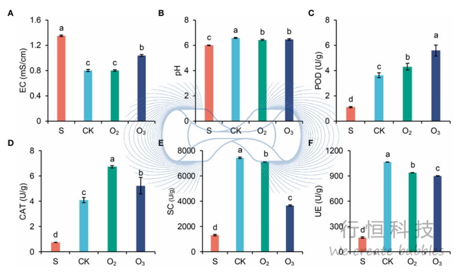 与原始基质(S组)相比,灌溉营养液后,所有处理组(CK, O₂, O₃)的pH值、过氧化氢酶(CAT)、过氧化物酶(POD)、脲酶(UE)和蔗糖酶(SC)活性均有所上升,而电导率(EC)下降。其中,O₃组的POD活性提升最显著: