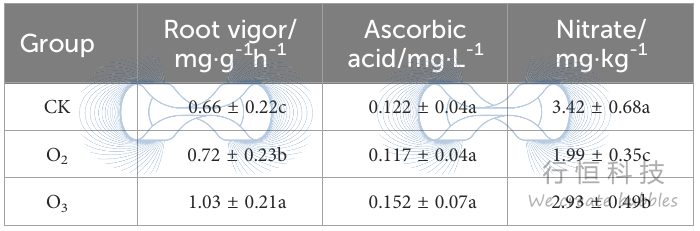 - 品质指标:O₂和O₃处理均显著提高了生菜根系的活力,并降低了叶片中的硝酸盐含量: