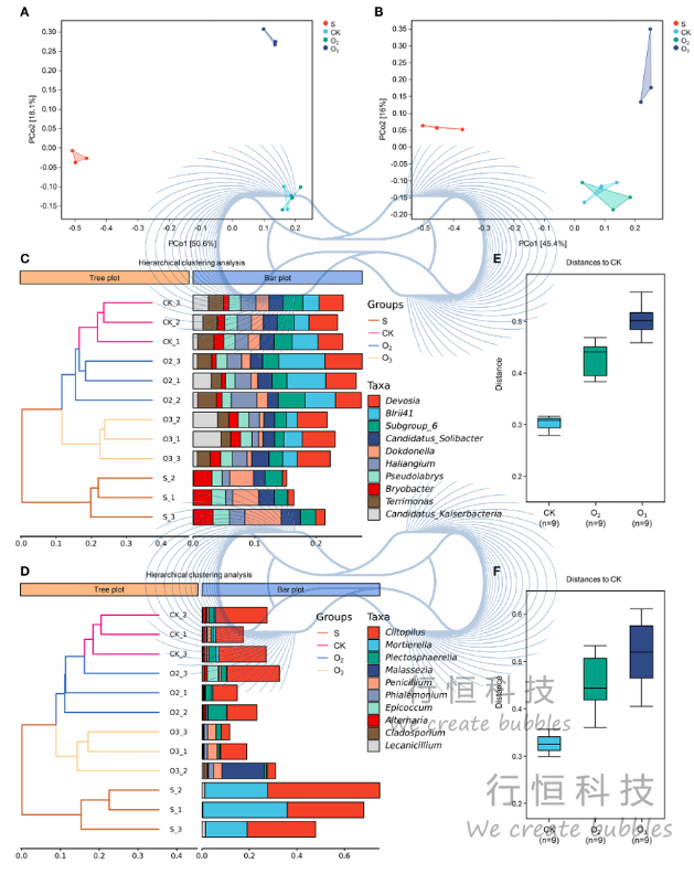 - Alpha多样性 :种植生草后(CK组),基质中细菌和真菌群落的丰富度和多样性均比原始基质(S组)有所增加。然而,施用微纳米气泡营养液(O₂和O₃组)后,这种多样性出现了下降,O₃组的影响更为显著: