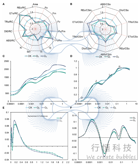 - 叶绿素荧光:OJIP曲线分析表明,O₂和O₃处理增强了光系统II(PSII)的反应中心活性和电子传递效率,其中O₃对放氧复合体(OEC)的促进效果更明显:
