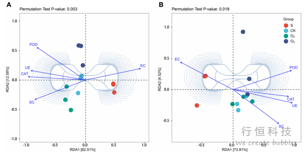 - 与环境因子的关联:冗余分析(RDA)表明,微生物群落结构与基质环境因子密切相关。O₃组的群落结构与较高的CAT和POD活性呈正相关: