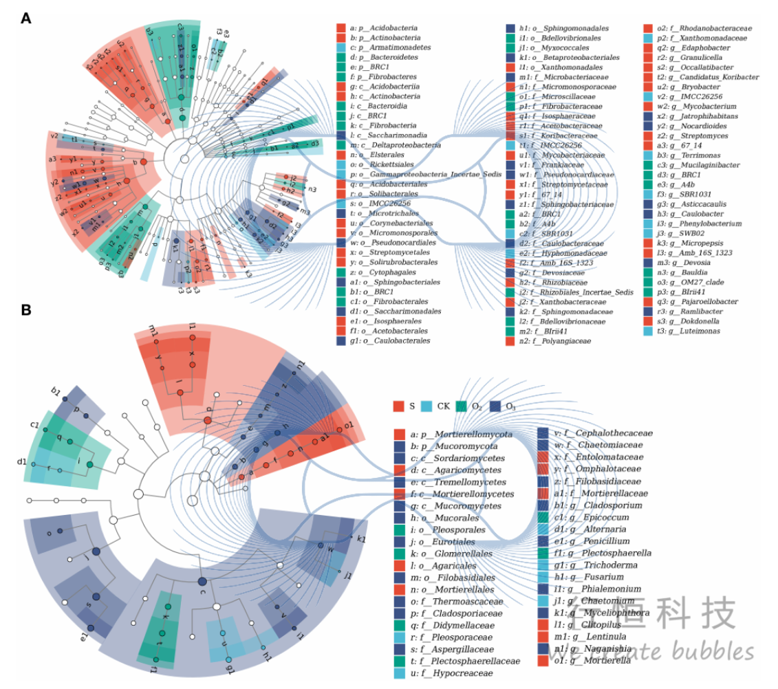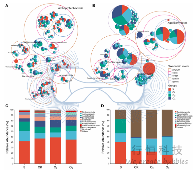 在门水平上,O₃处理降低了酸杆菌门(Acidobacteria)的相对丰度,并改变了变形菌门(Proteobacteria)、放线菌门(Actinobacteria)等的比例: