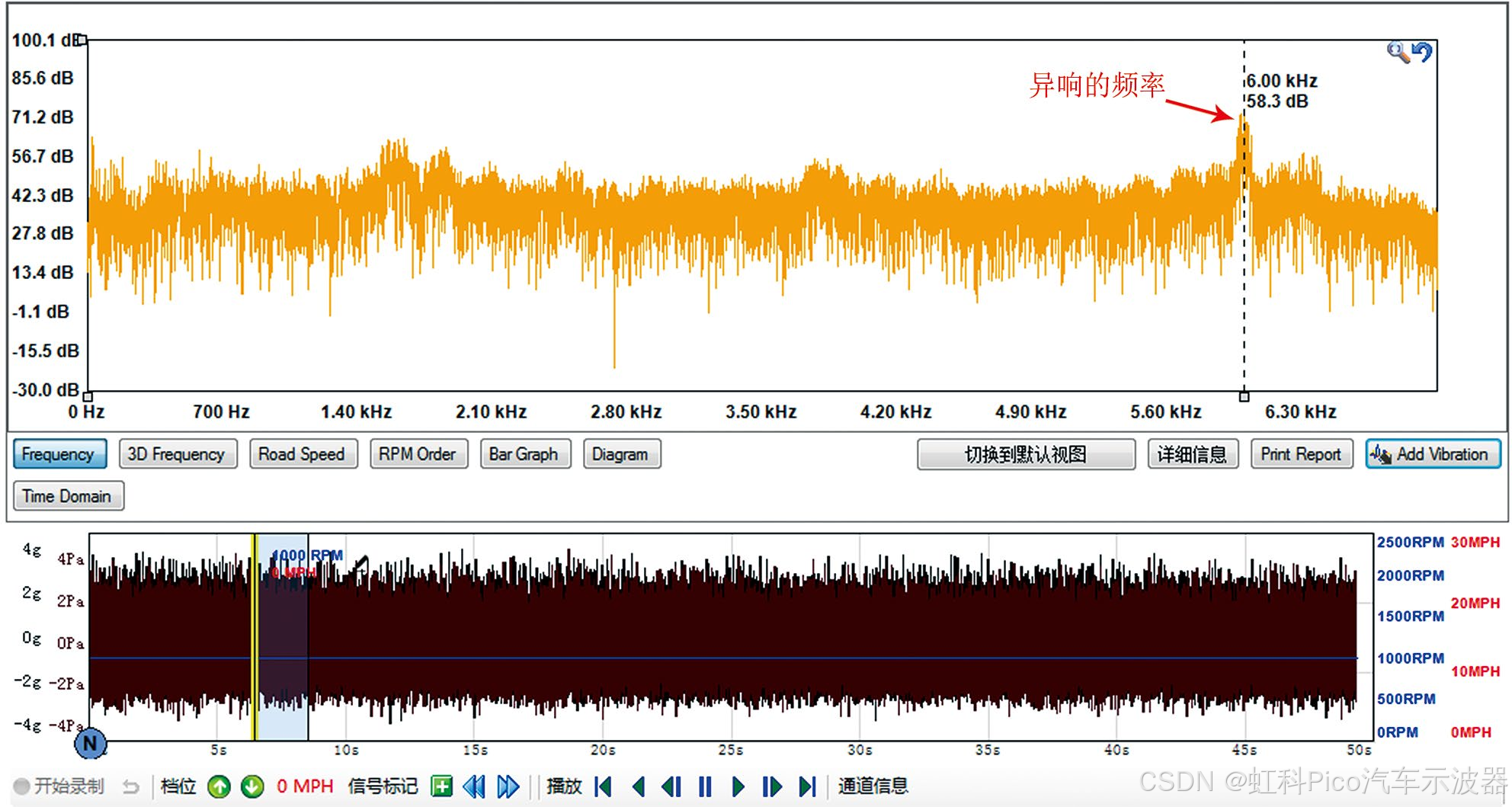 重点分析噪声信号(图2),发现异响的频率为6 kHz,强度为58.3 dB。