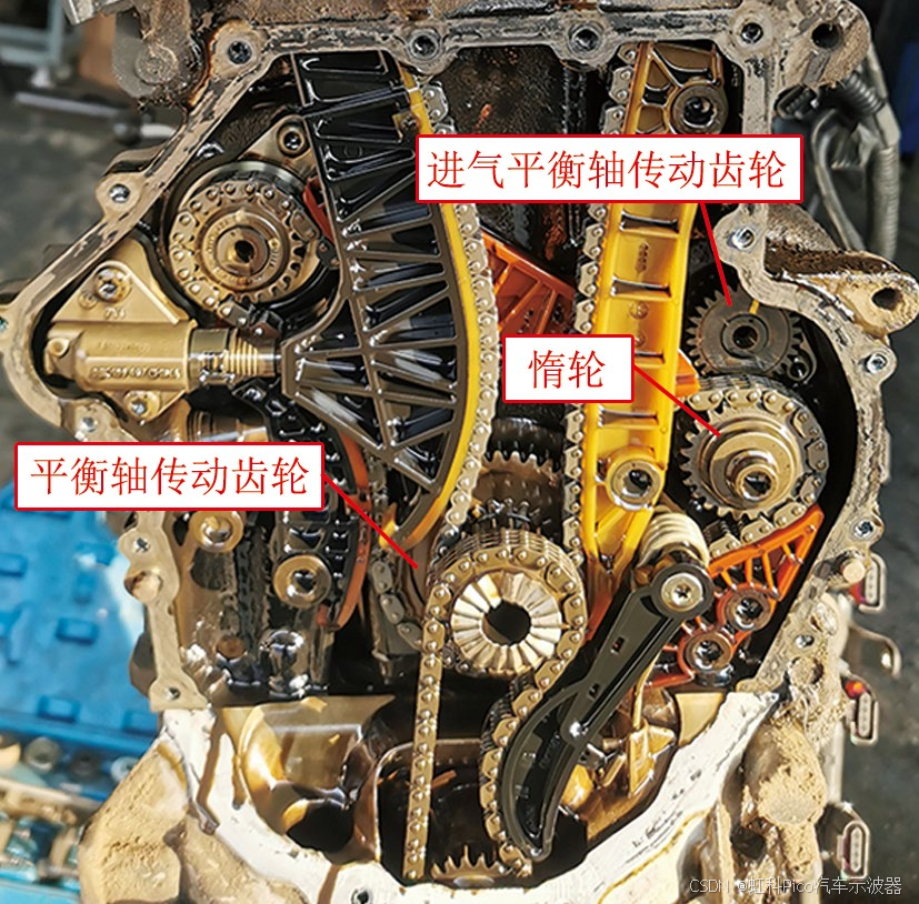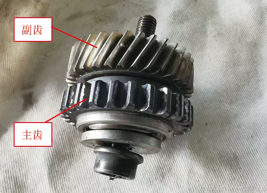 如图6所示,冷却液泵的动力传动路径为"曲轴→曲轴上的平衡轴传动齿轮(42个齿)→传动链条→惰轮主齿(24个齿)→惰轮副齿(32个齿)→进气平衡轴传动齿轮(28个齿)→进气平衡轴→进气平衡轴上的冷却液泵传动齿轮(17个齿)→齿形传动带→冷却液泵传动齿轮(29个齿)"。如图7所示,惰轮为双层齿组,主齿为直齿,副齿为斜齿。